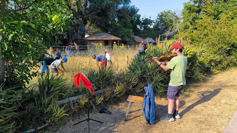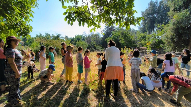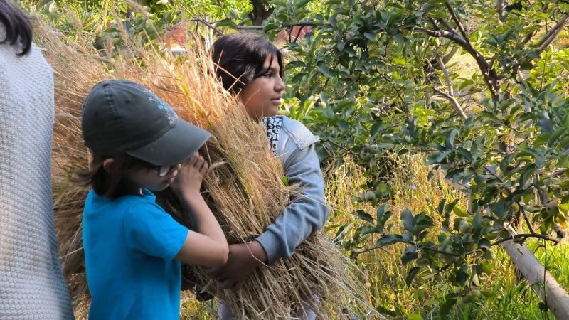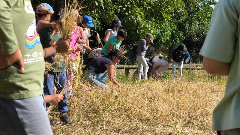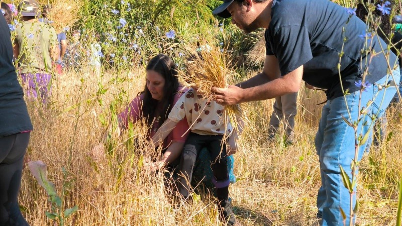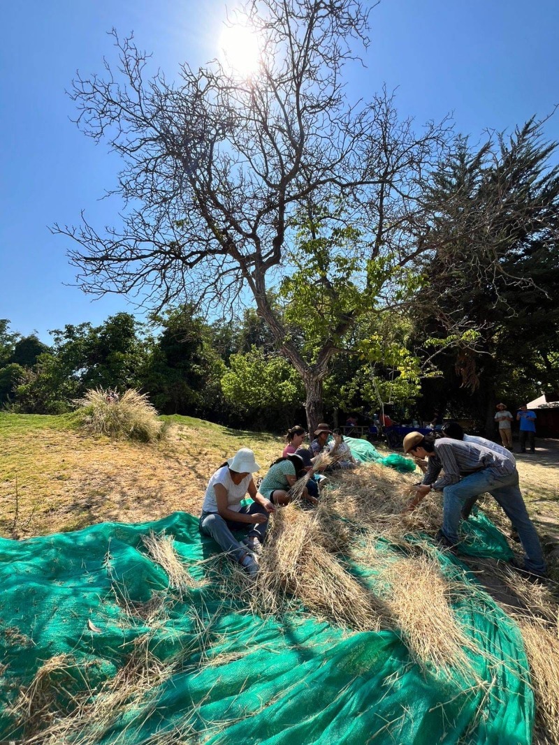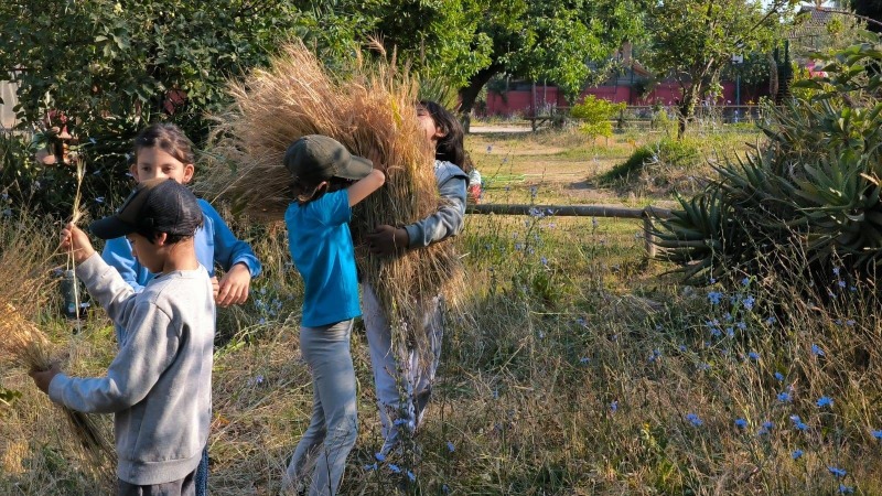 Recordamos a Zarathustra y con afán tomamos las hoz. Niños, niñas, madres, padres hermanos, hermanas y profesores segamos las espigas del trigo, mientras otros las reciben y limpian de ellas la paja, otros amarran ataditos para que se seque bien hasta la trilla. Todo al son de un violín y una quena, de historias de ancestros, trabajo y alegría del encuentro. Al terminar, nos unimos en una gran hilera que atraviesa el campo y, con delicada observación, recogemos cada una de las espigas que ha quedado por el camino.